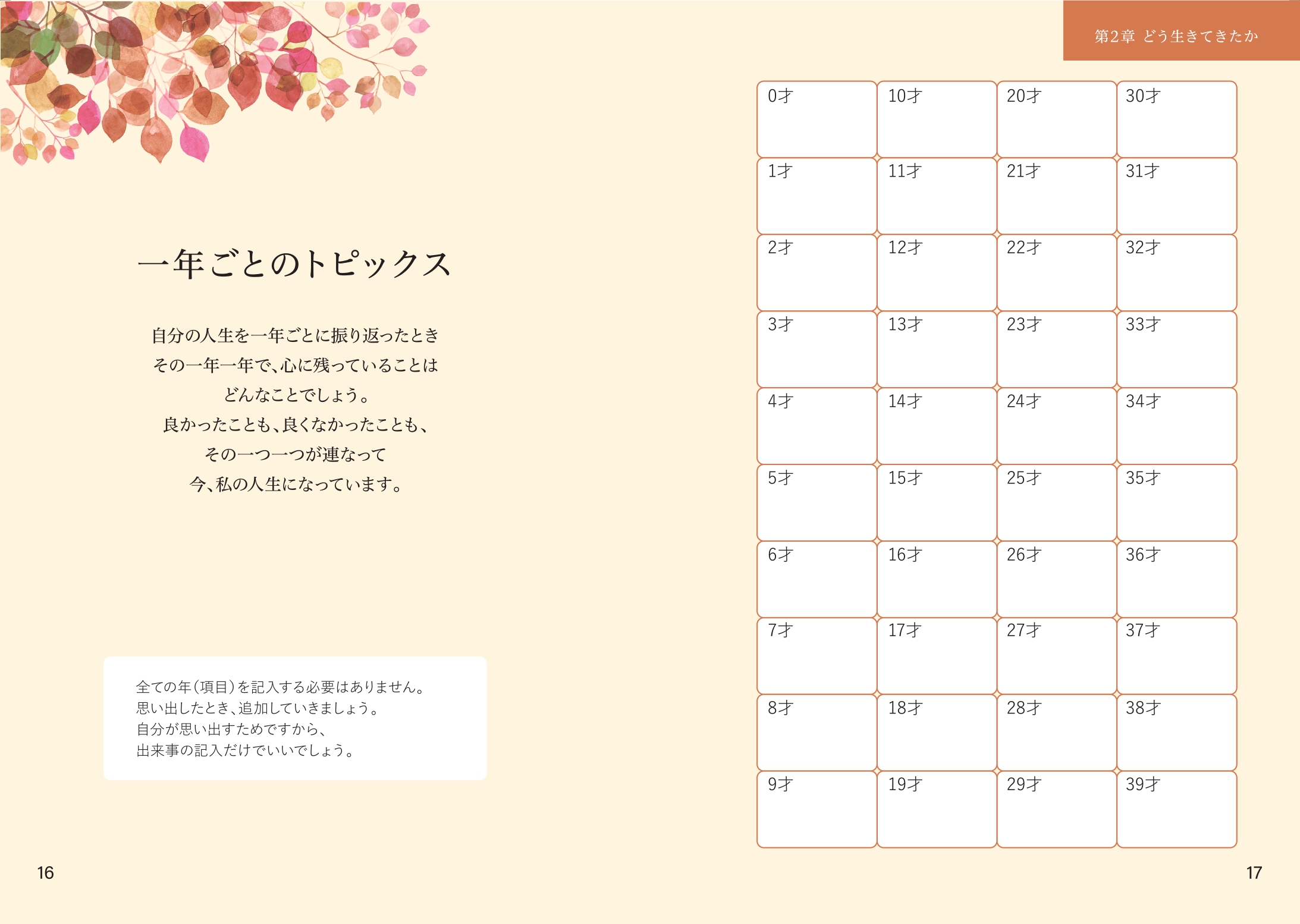 特に「過去」のページは、0歳から現在までを一年ごとに振り返る形式になっており、