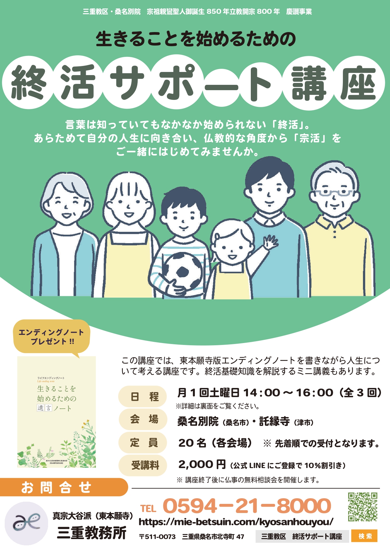 三重教区(桑名別院)*宗祖親鸞聖人御誕生850年立教開宗800年慶讃法要事業として、真宗会館発刊の『ライフエンディングノート 生きることを始めるための遺言ノート』を活用した「生きることを始めるための終活サポート講座(桑名別院会場第1回)が開催され19名のご門徒が集いました。